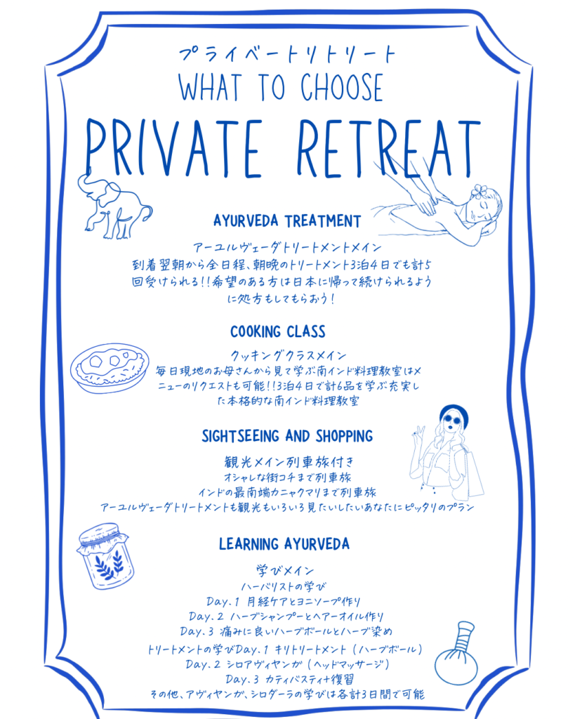 到着翌朝から全日程、朝はヨガと全身のオイルトリートメント午後はフェイシャルとヘッドマッサージ3泊4日でも毎日贅沢にトリートメントを受けましょう。ドクターによる問診、希望のある方は日本に帰国後に続けられるアーユルヴェーダ薬を処方もしてもらえます。